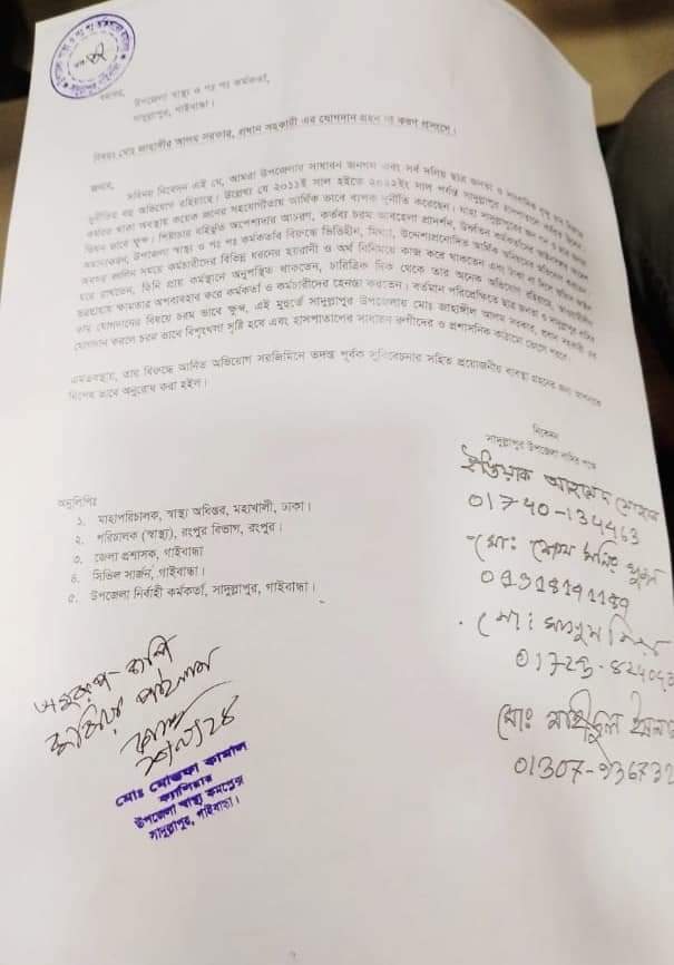 এরআগে, সাদুল্লাপুর উপজেলা স্বাস্থ্য কমপ্লেক্সে প্রধান সহকারীর দায়িত্বে ছিলেন জাহাঙ্গীর আলম। দীর্ঘদিন চাকুরী করা সময়ে অর্থ আত্মসাতসহ নানা অনিয়ম-দুর্নীতিতে জড়িয়ে পড়েন তিনি। একই সঙ্গে রেজিষ্টার কাগজে ফ্লুট ব্যবহার করে হাসপাতালের কর্মচারী-স্টাফদের হয়রানী করাসহ নানা অপকর্মে বিতর্বিত ছিলেন জাহাঙ্গীর আলম। এছাড়া তার বিরুদ্ধে অসদাচারণসহ নারী কেলেঙ্কারির অভিযোগও ছিলো। পরে এসব কারণে তাকে পলাশবাড়ি উপজেলা স্বাস্থ কমপ্লেক্সে বদলি করা হয়। কিন্তু বদলির দুই বছর যেতে না যেতেই আবারও তদবির করে সাদুল্লাপুর উপজেলা স্বাস্থ্য কমপ্লেক্সে বদলি নেন তিনি।