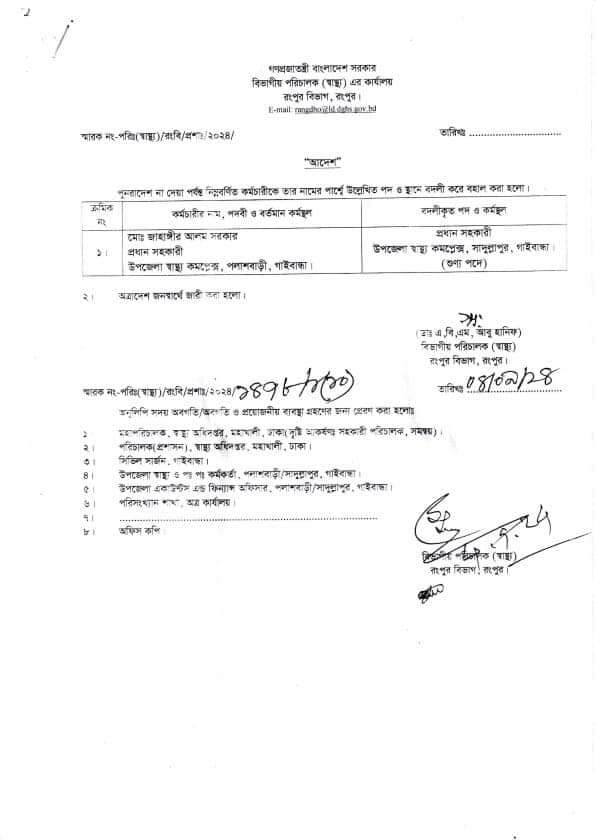 রংপুর বিভাগীয় পরিচালক (স্বাস্থ্য) ডা. এ, বি, এম আবু হানিফ গত ৪ সেপ্টেম্বর স্বাক্ষরিত (স্বারক নং১৪৭৮/১(১০) আদেশে পলাশবাড়ী উপজেলা স্বাস্থ কমপ্লেক্স থেকে প্রধান সহকারী জাহাঙ্গীর আলমকে সাদুল্লাপুর উপজেলা স্বাস্থ্য কমপ্লেক্সে বদলি করা হয়।