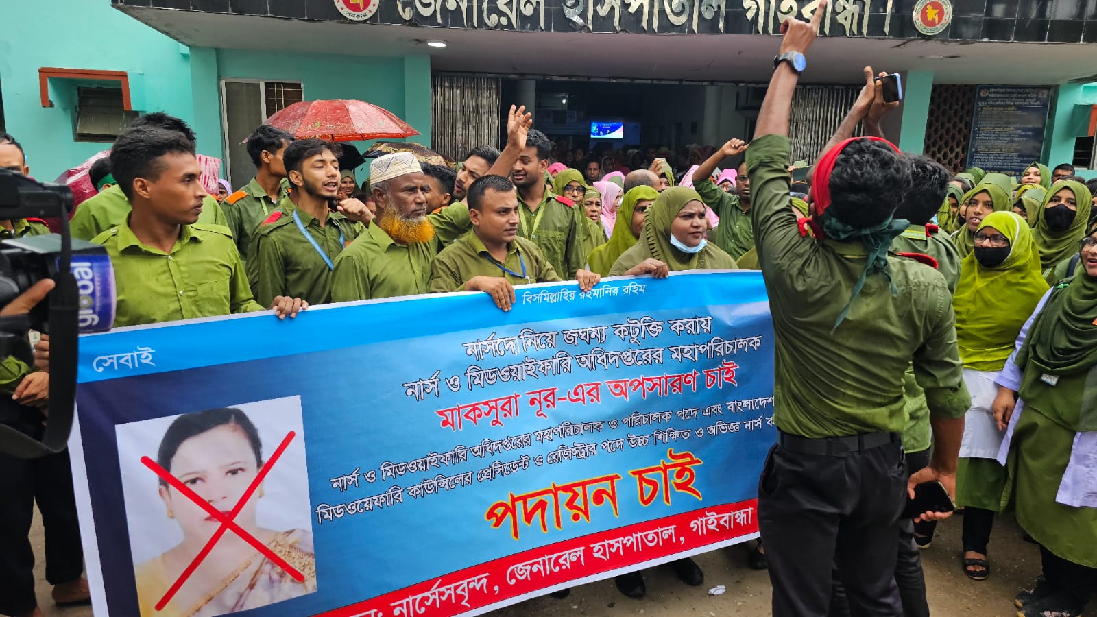 বিশেষ প্রতিনিধি: নার্সদের নিয়ে জঘন্য কটুক্তি করার প্রতিবাদে এবং নার্স ও মিডওয়াইফারি অধিদপ্তরের মহাপরিচালক মাকসুরা নূর এর অপসরনের দাবিতে মানববন্ধন এবং বিক্ষোভ করেছে গাইবান্ধার নার্সেস নেতৃবৃন্দ।