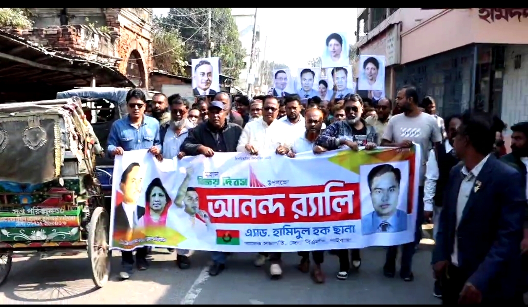 বৃহস্পতিবার (১৯ ডিসেম্বর) দুপুর ১২টার দিকে শহরের মুন্সিপাড়া-পূর্বপাড়া থেকে শুরু হওয়া বর্ণাঢ্য আনন্দ র্যালিটি শহরের ডিবি রোডসহ বিভিন্ন সড়ক প্রদক্ষিণ করে। লাল-সবুজের পতাকা হাতে আনন্দ র্যালিতে দলীয় নেতাকর্মী ছাড়াও হামিদুল হক ছানার অনুগত ও অনুসারীসহ বিভিন্ন শ্রেণি পেশার মানুষ অংশ নেয়।
