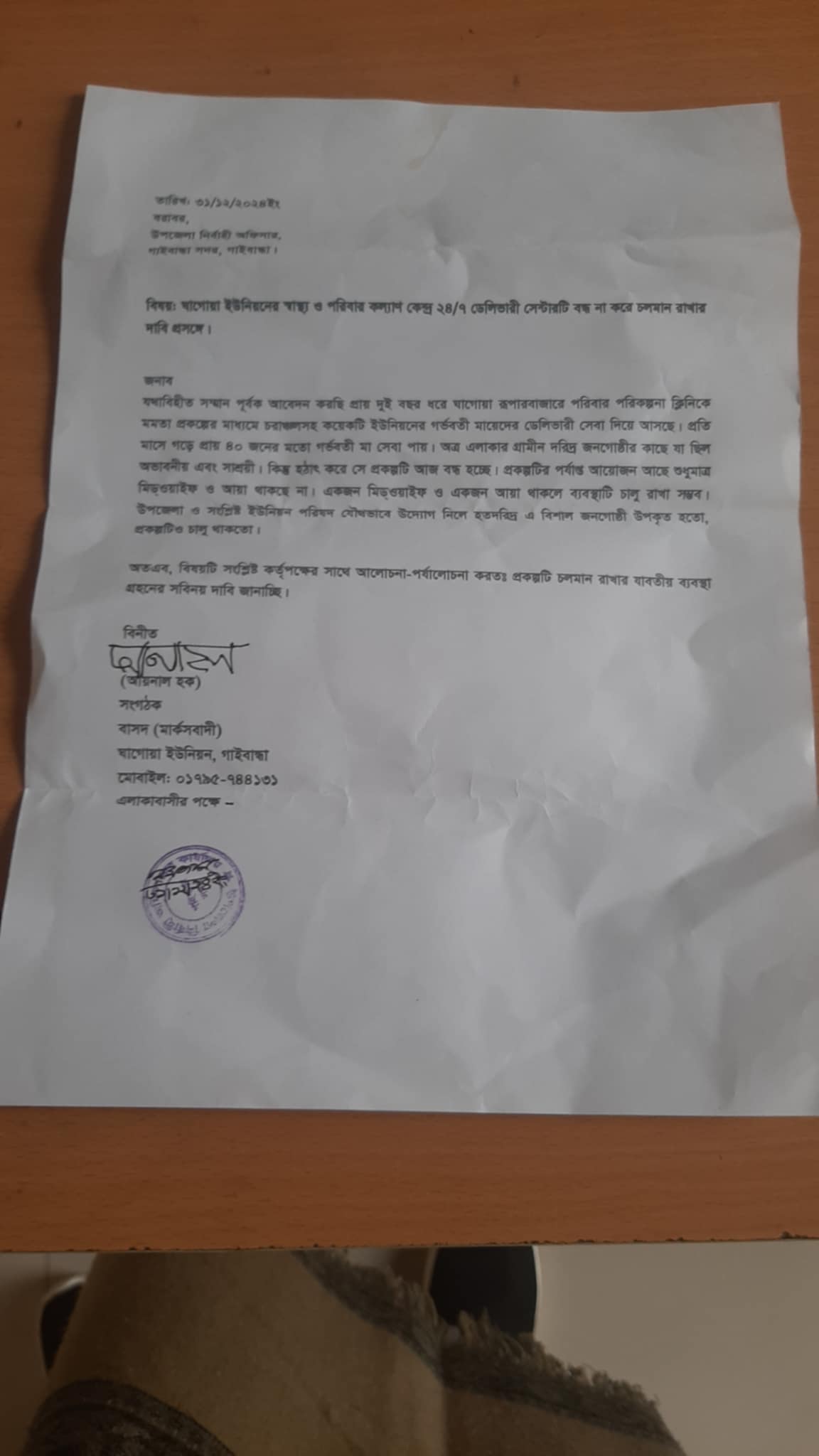 অত্র এলাকার গ্রামীণ দরিদ্র জনগোষ্ঠীর কাছে যা ছিল অভাবনীয় ও সাশ্রয়ী। কিন্তু হঠাৎ করে সে প্রকল্পটি আজ বন্ধ হচ্ছে। প্রকল্পটির পর্যাপ্ত আয়োজন আছে শুধুমাত্র মিড ওয়াইফ ও আয়া থাকছেনা। একজন মিডওয়াইফ ও একজন আয়া থাকলে ব্যাবস্থাটি চালু রাখা সম্ভব।