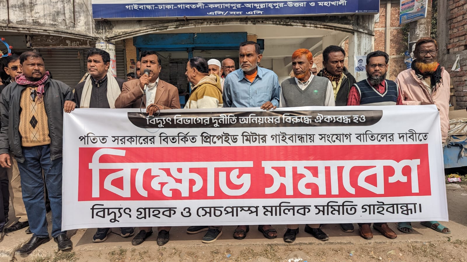 শহরের ডিবি রোডের গানাসাস মার্কেটের সামনে প্রতিবাদ সমাবেশে প্রিপেইড মিটার প্রতিরোধ কমিটি, গাইবান্ধার আহবায়ক গোলাম রব্বানী মুসার সভাপতিত্বে ও সাম্যবাদী আন্দোলনের মনজুর আলম মিঠুর পরিচালনায় বক্তব্য দেন সংগঠনের সদস্য সচিব মোশাররফ হোসেন বাবু, প্রবীণ রাজনীতিক আমিনুল ইসলাম গোলাপ, বীর মুক্তিযোদ্ধা এনামুল হক টুকু, গাইবান্ধা আদর্শ কলেজের সাবেক অধ্যক্ষ মমতাজুর রহমান বাবু, ক্রীড়া সংগঠক ওয়াজিউর রহমান রাফেল, রাজনীতিক বীর মুক্তিযোদ্ধা ময়নুল ইসলাম রাজা, শ্রমিক নেতা রেজাউন্নবী রাজু, সংস্কৃতি সংগঠক দেবাশীষ দাশ দেবু, গাইবান্ধা বার অ্যাসোসিয়েশনের সাবেক সাধারণ সম্পাদক অ্যাড. সিরাজুল ইসলাম বাবু, জেলা বিএনপির সাংগঠনিক সম্পাদক আনিছুর রহমান নাদিম, জাতীয় পার্টির আনোয়ারুল ইসলাম লেবু, দলিল লেখক সমিতির সাধারণ সম্পাদক মোস্তা মল্লিক, রাজনীতিক রেবতী বর্মণ, শ্রমিক নেতা কাজী আব্দুল ওয়াদুদ, বাসদ মার্কসবাদীর নিলুফার ইয়াসমিন শিল্পী, বিদ্যুৎ গ্রাহক ও সেচ পাম্প মালিক সমিতির আসাদুজ্জামান শাহীন, মাসুদার রহমান, সমাজকর্মী মনির হোসেন সুইট, সোমা ইসলাম, সাম্যবাদী আন্দোলনের সবুজ মিয়া প্রমুখ।