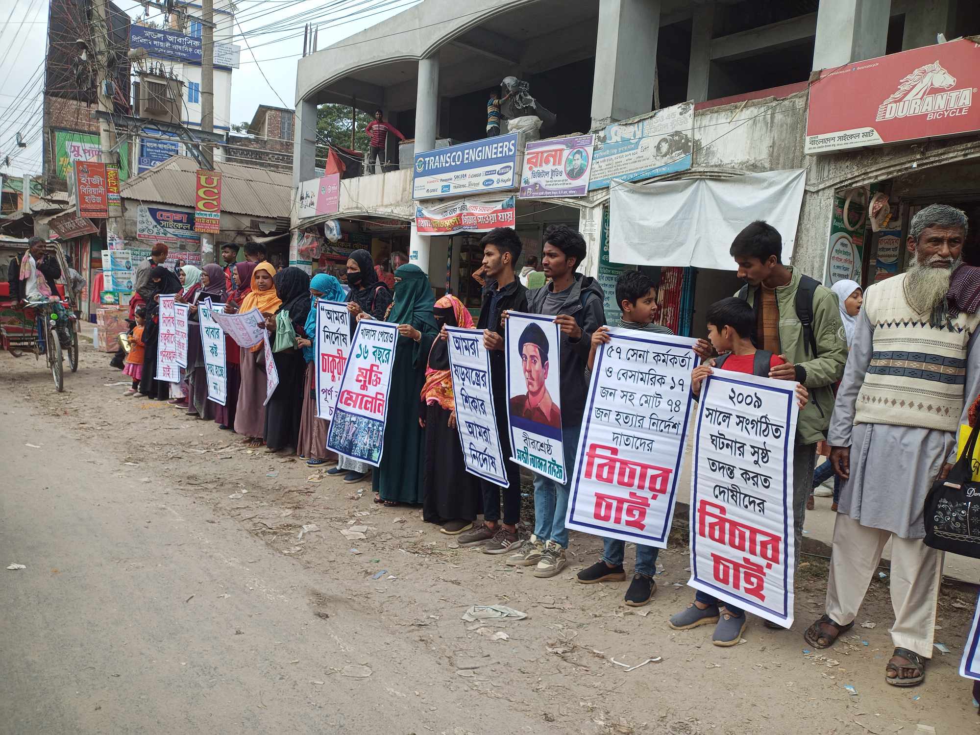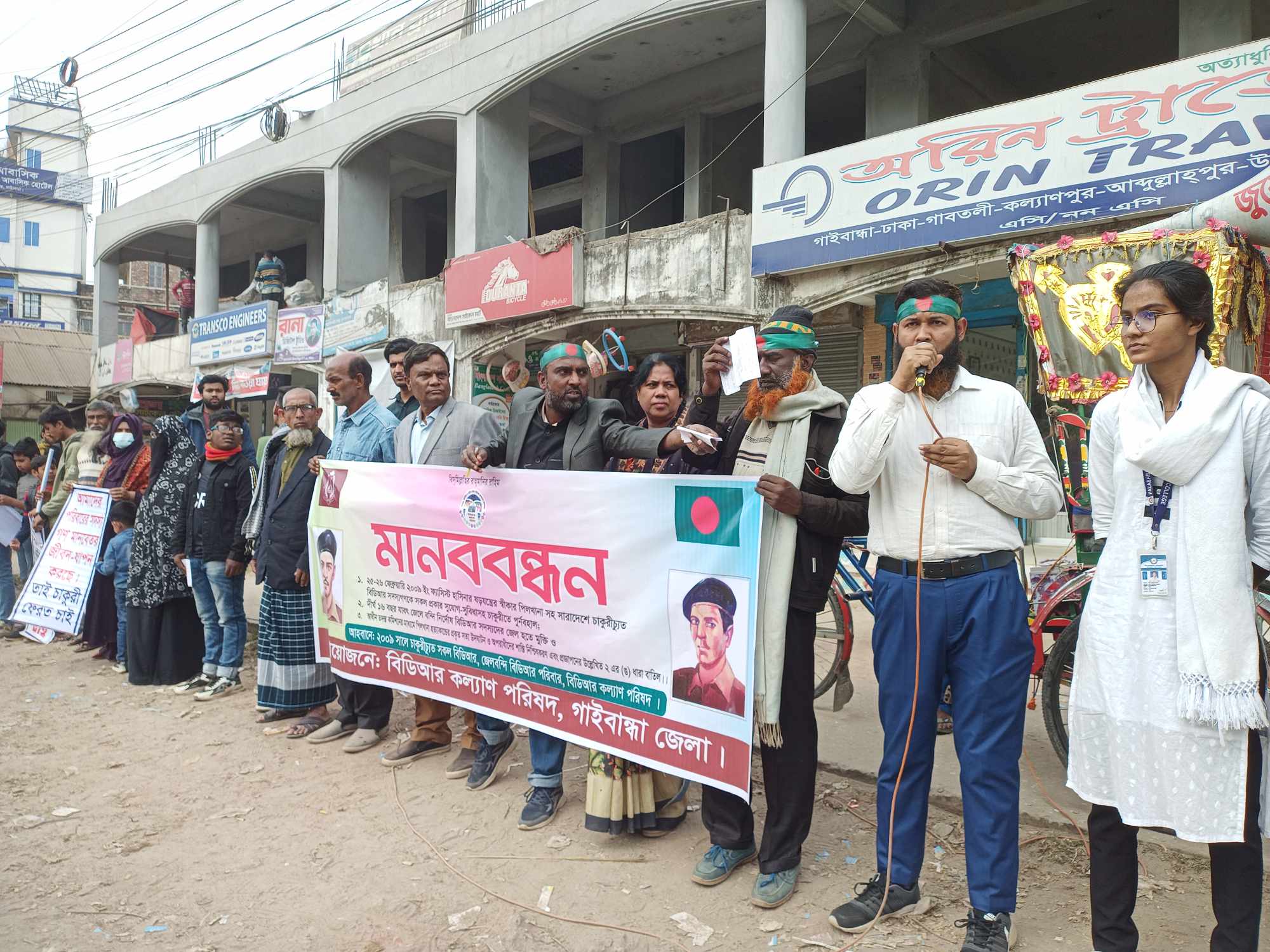 বিশেষ প্রতিনিধি: পিলখানায় ৫৭ সেনা অফিসারসহ ৭৪ জন হত্যাকাণ্ডের সাথে জড়িতদের দৃষ্টান্তমূলক শাস্তিসহ ৩ দফা দাবিতে রোববার গাইবান্ধা ডিবি রোডের গানাসার্স মার্কেটের সামনে এক মানববন্ধন কর্মসূচি পালন করা হয়। বিডিআর কল্যাণ পরিষদ গাইবান্ধা জেলা এই মানববন্ধন কর্মসূচির আয়োজন করে। এর আগে পিলখানা হত্যাকান্ড ও ছাত্র-জনতার অভ্যুত্থানে শহীদদের উদ্দেশ্যে এক মিনিট নিরবতা পালন করা হয়।