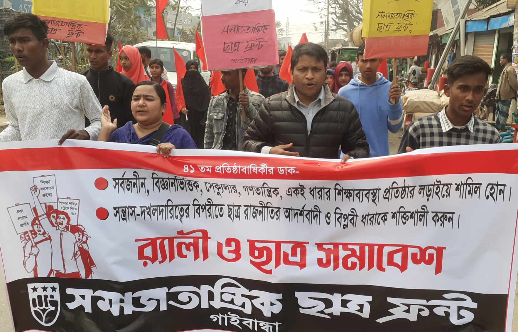 উক্ত সমাবেশে জেলা সভাপতি পরমানন্দ দাসের সভাপতিত্বে এবং সাধারণ সম্পাদক রাহেলা সিদ্দিকার পরিচালনায় বক্তব্য রাখেন গাইবান্ধা সরকারি কলেজ শাখার সাধারণ সম্পাদক কামরুল হাসান,মোখলেছুর রহমান, কল্লোল কুমার বর্মন, ধন্নজয় কুমার, প্রমূখ।বক্তাগণ বলেন সমাজতান্ত্রিক ছাত্র ফ্রন্ট প্রতিষ্ঠালগ্ন থেকেই শিক্ষার বেসরকারিকরণ- বাণিজ্যিকীকরন ও সংকোচনের বিরুদ্ধে লড়াই সংগ্রাম করে আসছে তারই ধারাবাহিকতায় আজ ৪১তম প্রতিষ্ঠাবার্ষিকী পালিত হচ্ছে দিন দিন শিক্ষারমান ক্রমাগত ধ্বংস হচ্ছে। বছর বছর পুনঃভর্তির নামে শিক্ষার্থীদের কাছ থেকে ফি আদায় হচ্ছে ,অন্যায় এবং অযৌক্তিক সকল ফি বাতিল করতে হবে।