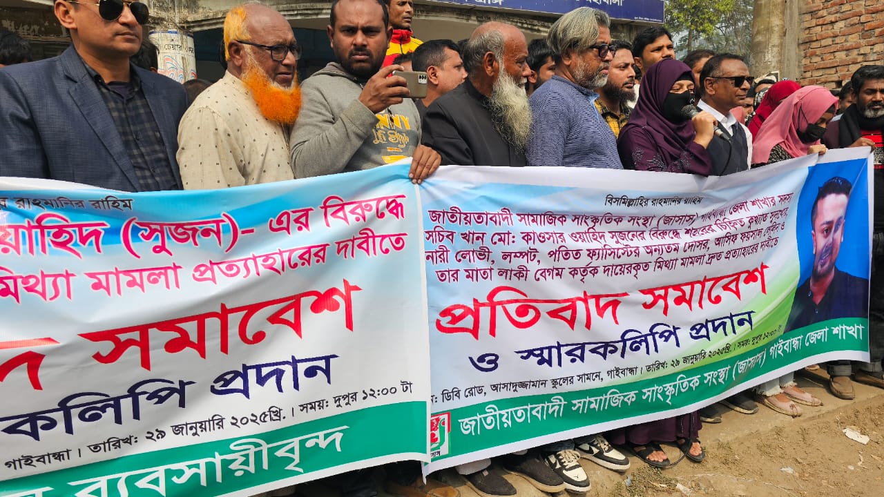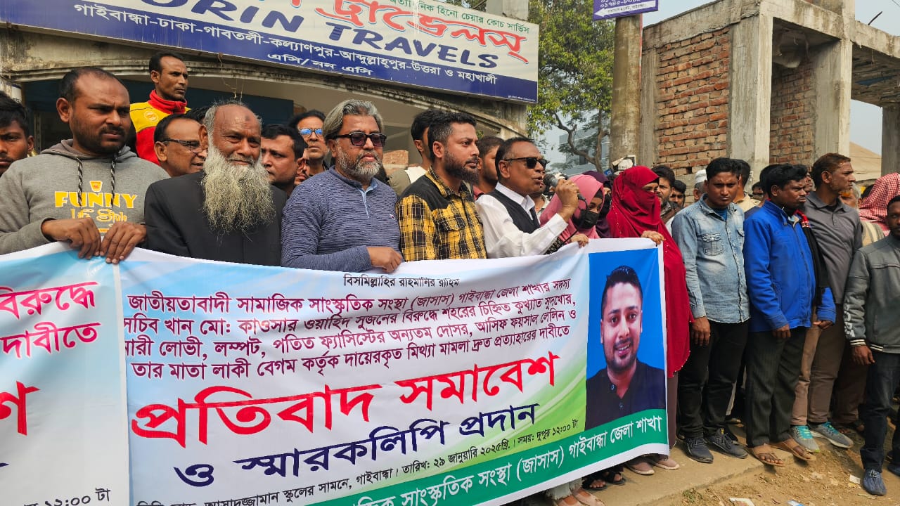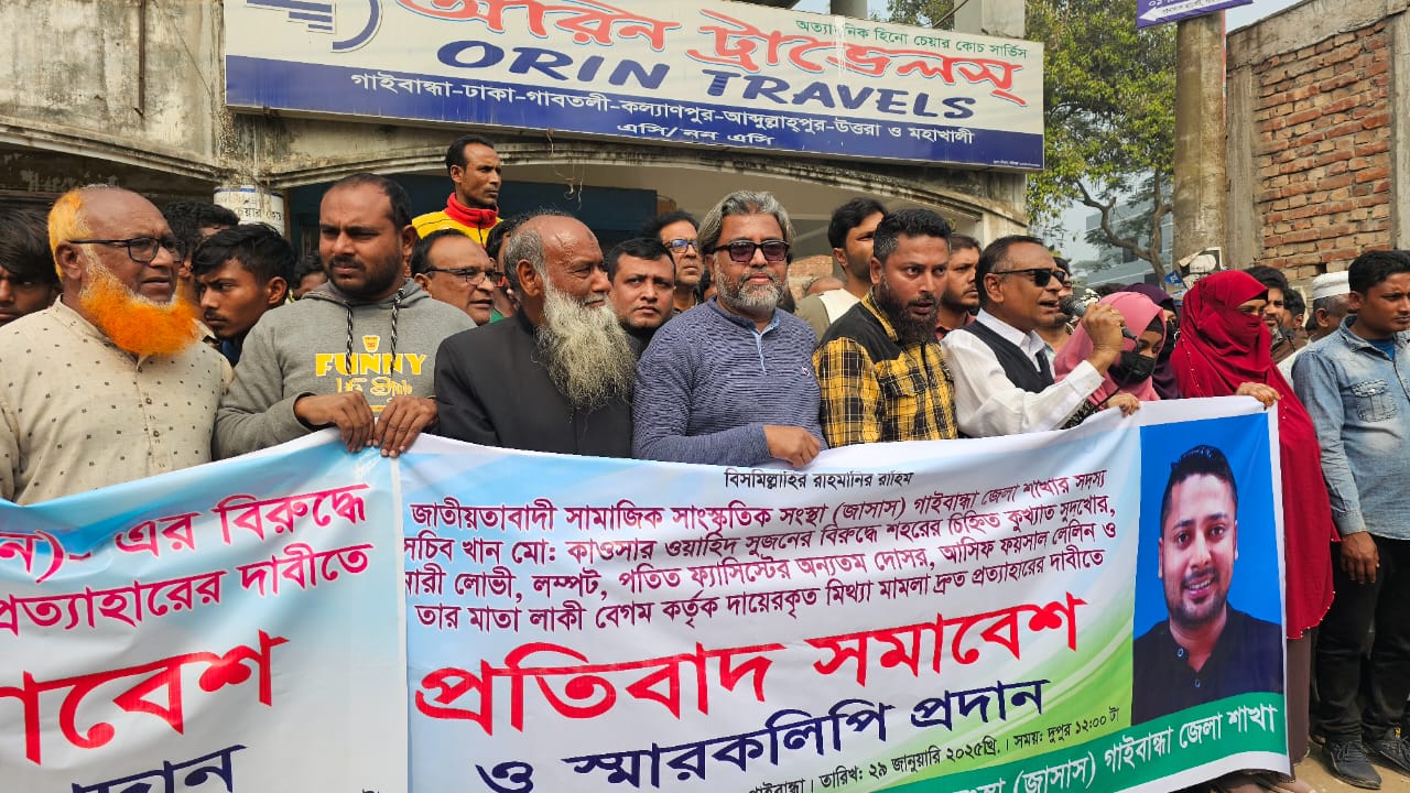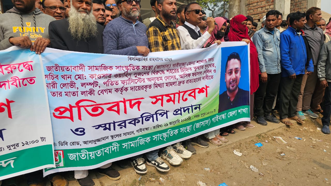 বিশেষ প্রতিনিধি: গাইবান্ধা সদর  থানার অফিসার ইনচার্জ কতৃক গাইবান্ধা জাসাস জেলা শাখার সদস্য সচিব খান মোঃ কাওয়ার ওয়াহিদ (সুজন) এর বিরুদ্ধে ষড়যন্ত্র ও হয়রানিমূলক মিথ্যা মামলা প্রত্যাহারের দাবিতে  প্রতিবাদ সমাবেশ ও সড়ক অবরোধ করে বিক্ষোভ  অনুষ্ঠিত হয়েছে।
