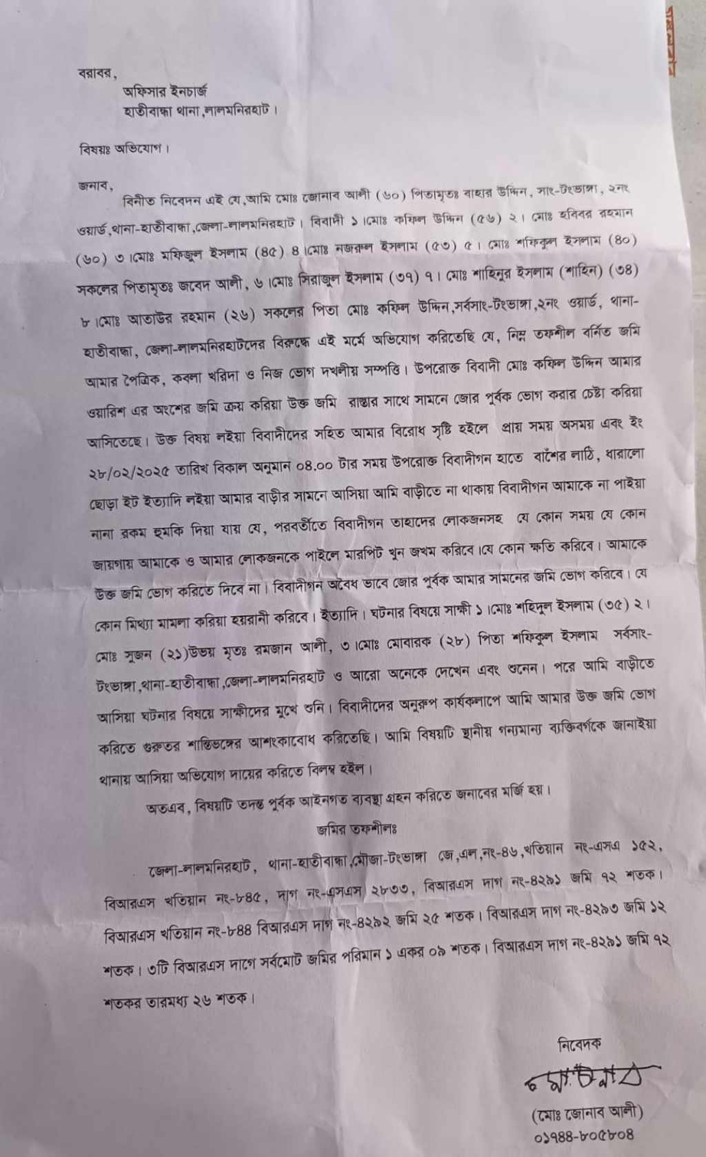 থানায় দায়ের করা প্রাপ্ত অভিযোগে জানাযায, বিগত সময়ে আওয়ামীলীগ ক্ষমতা থাকা কালে হাতীবান্ধা উপজেলা পরিষদের চেয়ারম্যান নির্বাচিত হন উপজেলা আওয়ামীলীগের সভাপতি লিয়াকত হোসেন বাচ্চু। ঐ সময় তার ঘনিষ্ঠ সহযোগি টংভাঙ্গা গ্রামের ওয়ার্ড আওয়ামীলীগের সাবেক সহ সভাপতি সিরাজুল ইসলাম সাজু ক্ষমতার প্রভাব দেখিয়ে তার প্রতিবেশি কৃষক জোনাব আলীর জমি দখল করে চাতাল ও গুদাম নির্মাণ করে।