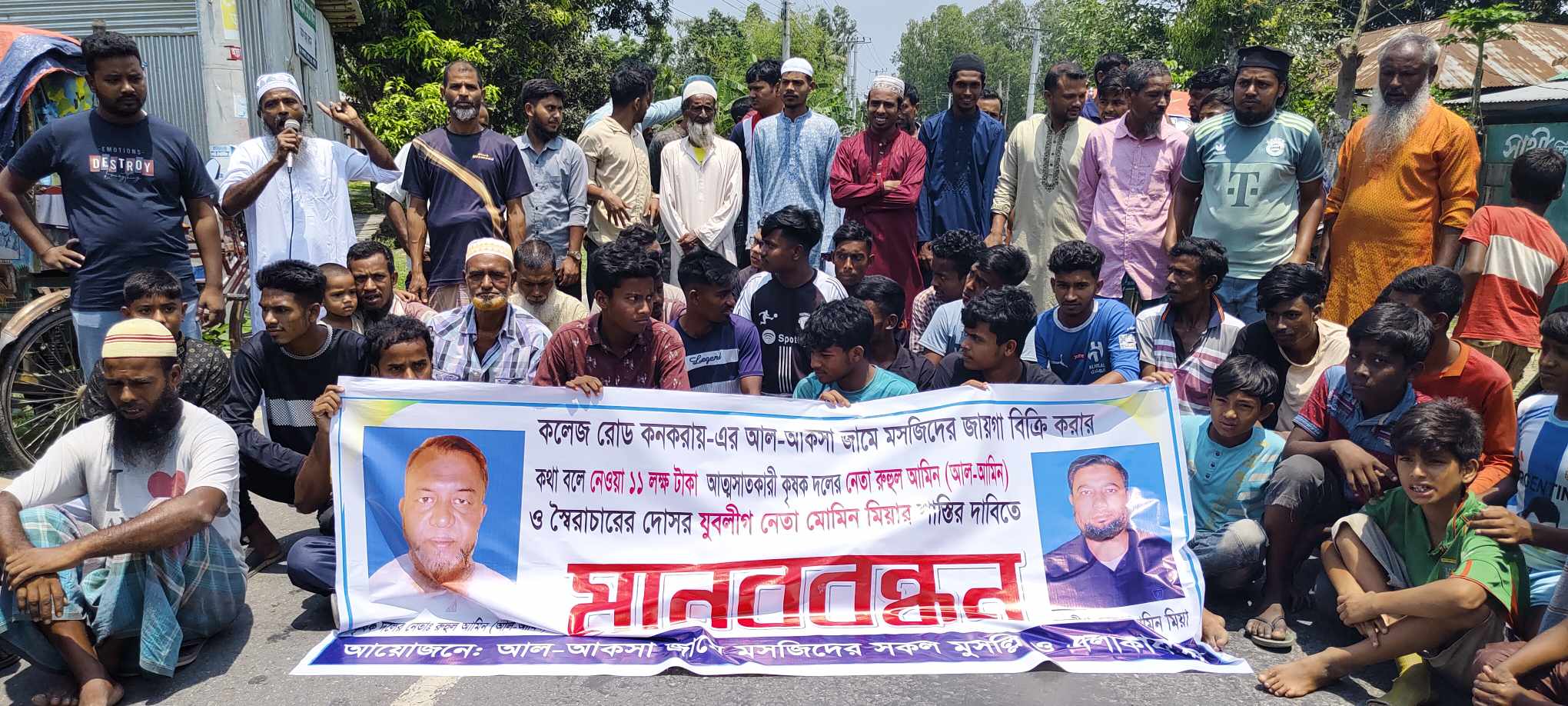 শুক্রবার সকাল ১১টায়, জুমার নামাজের পূর্বে মসজিদের সামনে আল-আকসা জামে মসজিদের সকল মুসল্লি ও এলাকাবাসীর আয়োজনে মানববন্ধনে এলাকাবাসী রাস্তা অবরোধ করে এ বিক্ষোভ করেন।
