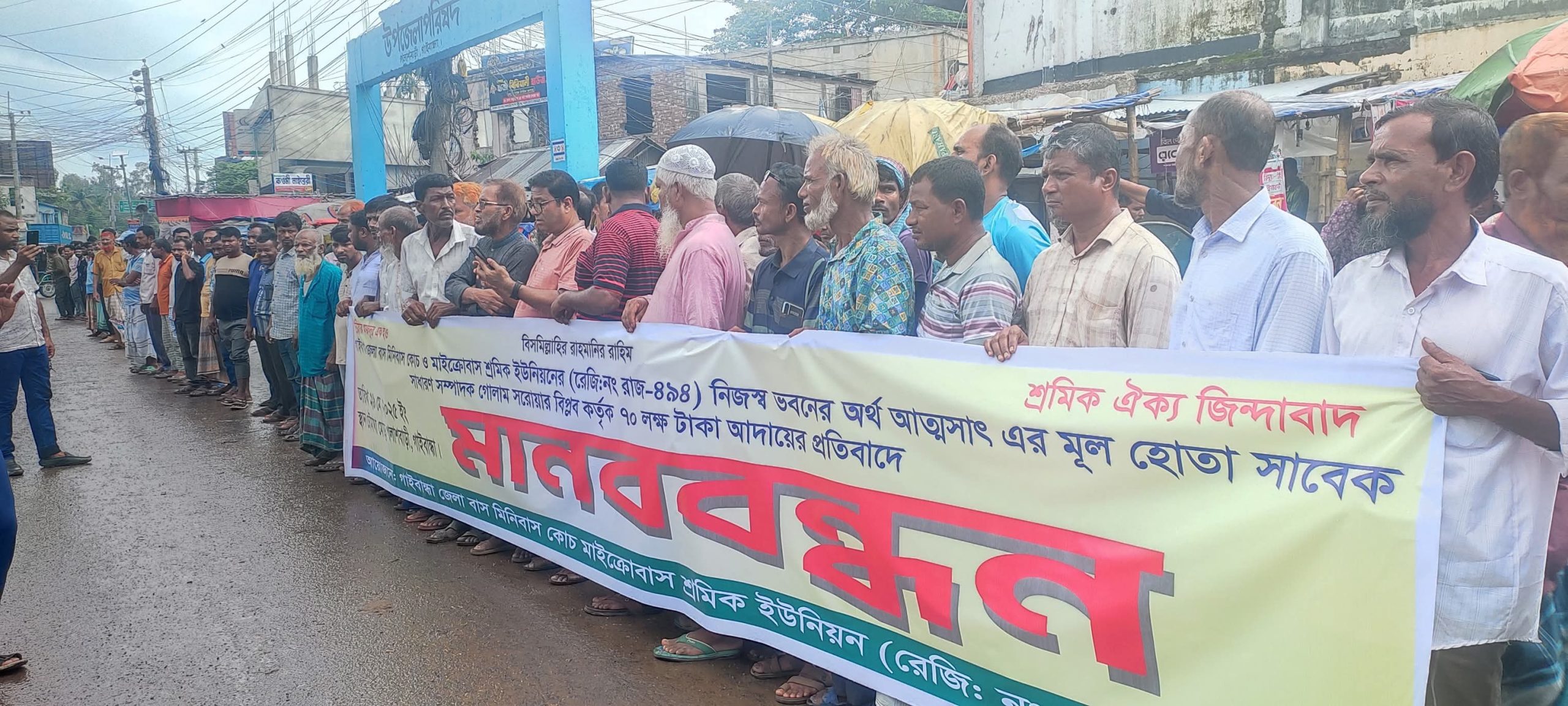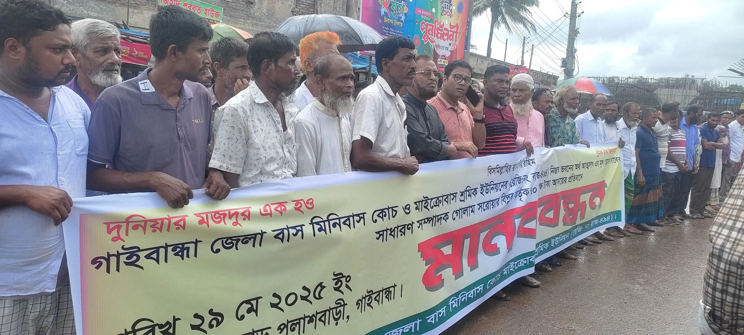 বিশেষ প্রতিনিধি : গাইবান্ধা জেলা বাস-মিনিবাস ও মাইক্রোবাস শ্রমিক ইউনিয়নের সাবেক সাধারণ সম্পাদক এবং পলাশবাড়ী পৌরসভার সাবেক মেয়র গোলাম সারোয়ার প্রধান বিপ্লব কর্তৃক আত্মসাতকৃত ৭০ লাখ টাকা উদ্ধার ও বিচারের দাবিতে মানববন্ধন ও সড়ক অবরোধ কর্মসূচি পালিত হয়েছে।