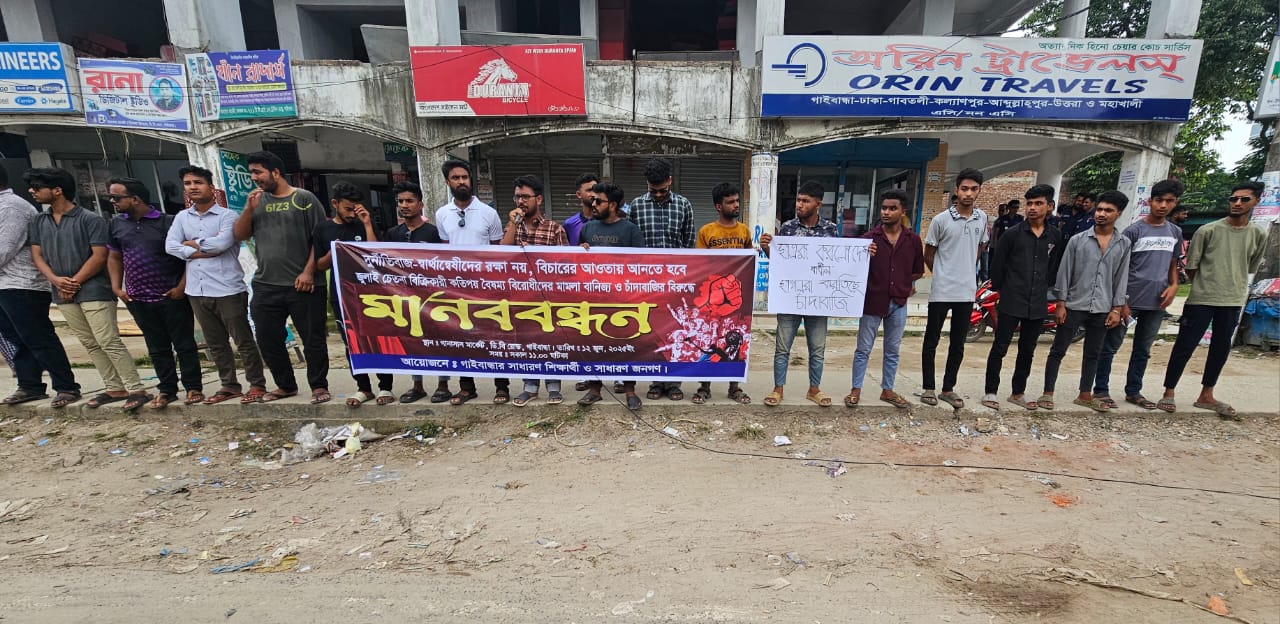 গাইবান্ধার সাধারণ শিক্ষার্থী ও সাধারণ জনগণের আয়োজনে আজ সকালে শহরের ১ নং ট্রাফিক মোড়ে এ মানববন্ধন অনুষ্ঠিত হয়।