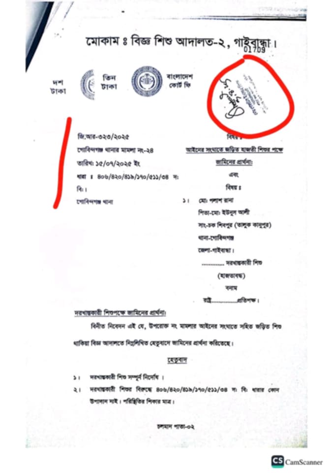 এমন অবৈধ অনৈতিক কর্মকান্ডের প্রতিবাদে রহমত আলী নামের একজন প্রধান বিচারপতি বরাবরে লিখিত অভিযোগ করেছে। অভিযোগ সুত্রে জানা গেছে দায়রা জজ আদালতে ফৌঃ মিস কেস নং ৯৩৫/২৫ মামলা জামিন শুনানির জন্য পেন্ডিং থাকাবস্থায় আসামি পলাশ রানা নামের শেষে রানা’র স্থলে মিয়া যুক্ত করে নতুন জন্ম নিবন্ধন বানিয়ে বয়স কম দেখিয়ে গাইবান্ধা জেলা নারী ও শিশু দ্বিতীয় আদালতে আসামি কে শিশু দেখিয়ে জামিনের আবেদন করেন। যা আইনকে বৃদ্ধাঙ্গুলি দেখানোর সামিল।