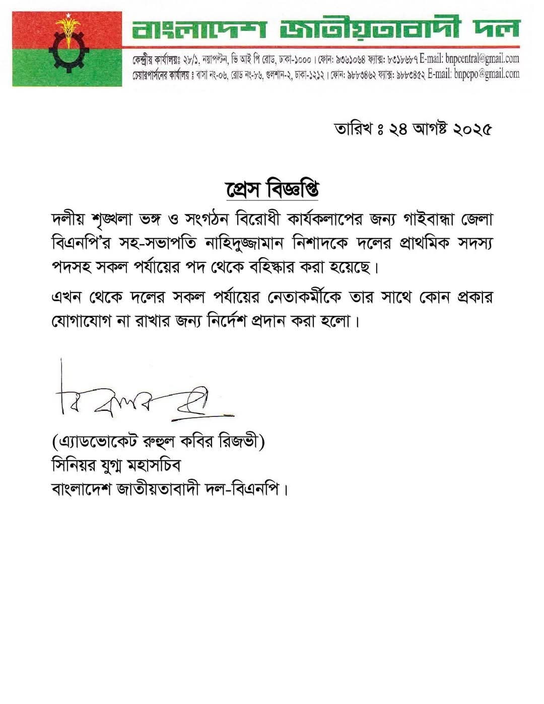 বিজ্ঞপ্তিতে বলা হয়, দলীয় শৃঙ্খলা পরিপন্থী কর্মকাণ্ডের কারণে নাহিদুজ্জামান নিশাদকে জেলা বিএনপি’র সহ-সভাপতির পদ থেকে বহিষ্কার করা হলো। একই সঙ্গে তাকে প্রাথমিক সদস্য পদ থেকেও অব্যাহতি দেওয়া হয়েছে।