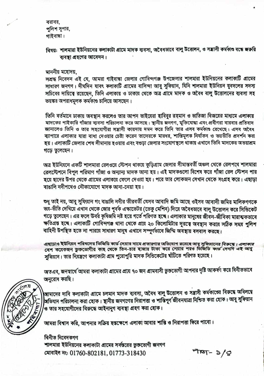 এ অবস্থার পরিবর্তনের দাবিতে সম্প্রতি কলাকাটা গ্রামের প্রায় ১০০ মানুষ স্বাক্ষর করে আবু সুফিয়ানের বিরুদ্ধে লিখিত অভিযোগ জমা দিয়েছেন। অভিযোগপত্রটি গাইবান্ধা সেনা ক্যাম্পের পাশাপাশি জেলা পুলিশ সুপারের কাছেও দেওয়া হয়েছে। এতে তার মাদক ব্যবসা, বালু সিন্ডিকেট ও কার্ড বাণিজ্যের বিস্তারিত উল্লেখ করা হয়েছে।