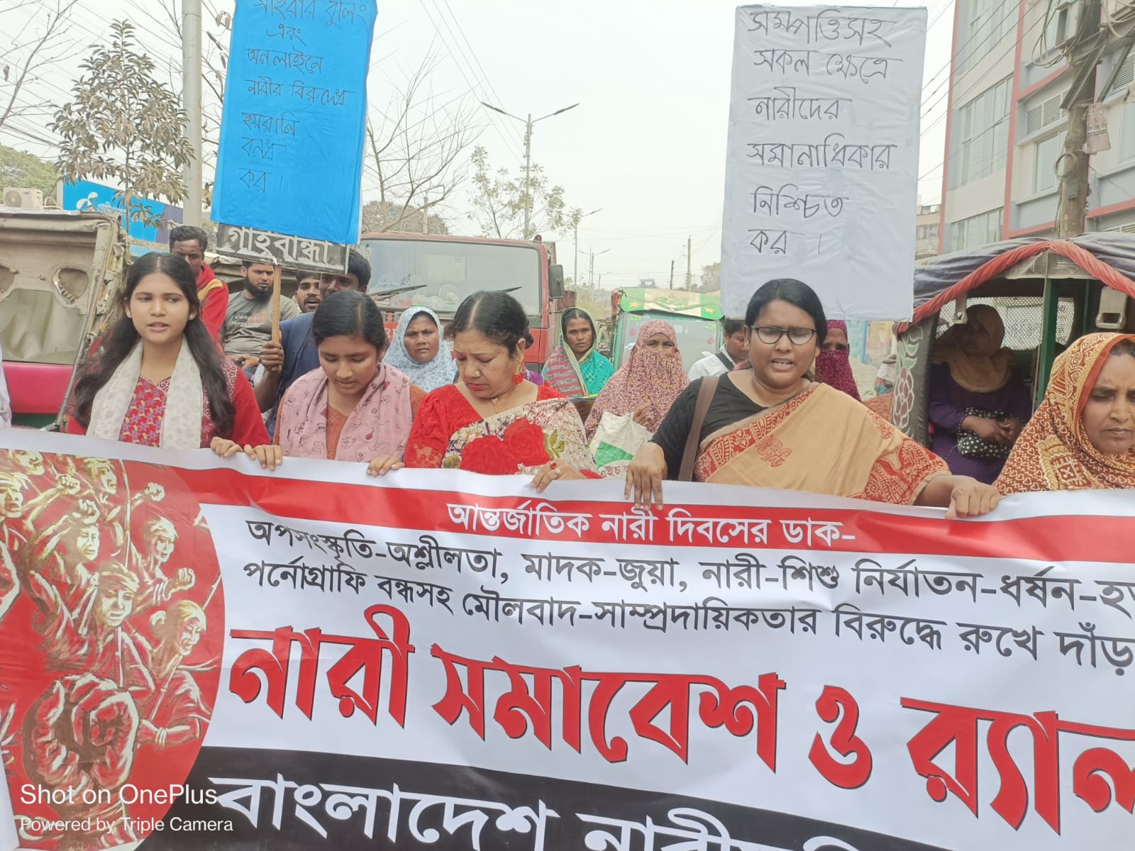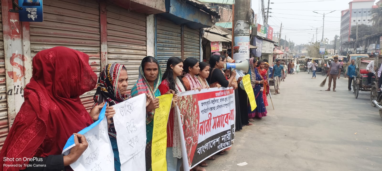 সংগঠনের জেলা সভাপতি সুভাসিনী দেবীর সভাপতিত্বে সমাবেশে বক্তব্য রাখেন সাধারণ সম্পাদক অ্যাডভোকেট নিলুফার ইয়াসমিন শিল্পী। এছাড়াও বক্তব্য প্রদান করেন স্কুল শিক্ষিকা নিশাত পারভীন বর্না, মাসুদা আক্তার, কলি রানী এবং আশরাফি আশা প্রমুখ।