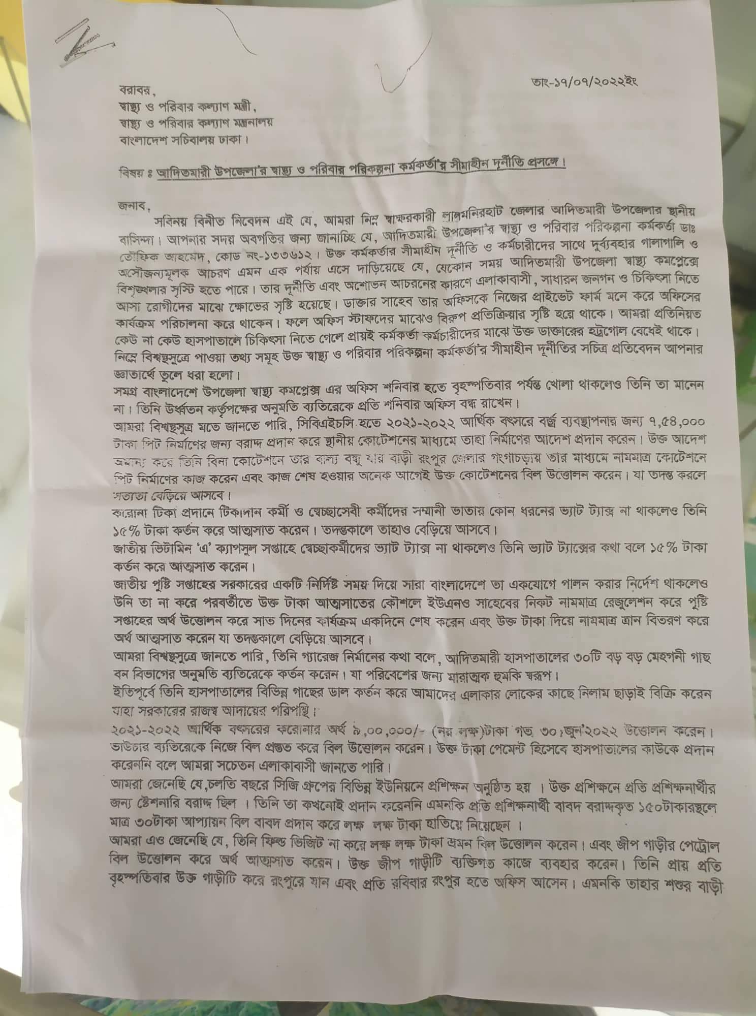 তিনি স্বাস্থ্য ও পরিবার পরিকল্পনা কর্মকর্তা অথচ তারই কথাতেই চলে আদিতমারী স্বাস্থ্য কমপ্লেক্স