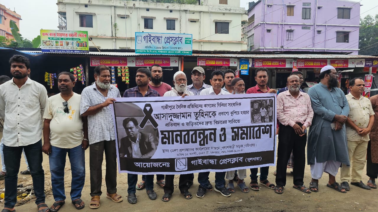 বিশেষ প্রতিনিধি : গাজীপুরে প্রকাশ্যে কুপিয়ে সাংবাদিক তুহিনকে হত্যা ও সারাদেশে নৈরাজ্য, চাঁদাবাজীর প্রতিবাদে মানববন্ধন অনুষ্ঠিত হয়েছে গাইবান্ধায়। গাইবান্ধা প্রেসক্লাব