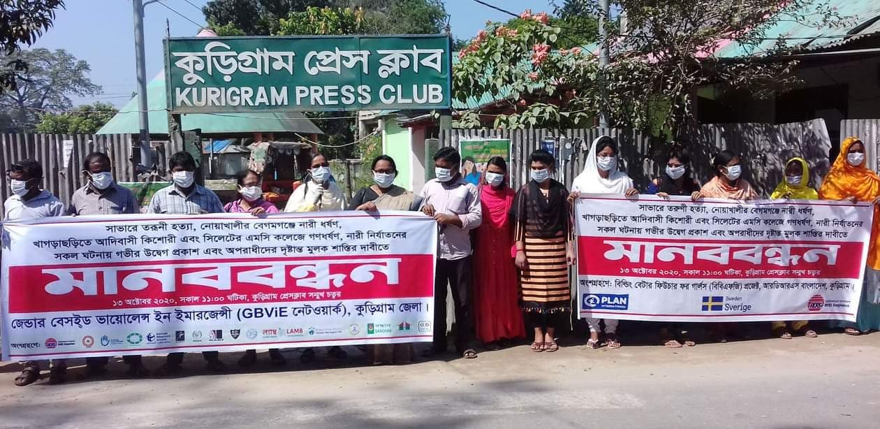 কুড়িগ্রামে জেন্ডার বেইজড ভায়োলেন্স ইন ইমারজেন্সি নেটওয়ার্কের ধর্ষকদের শাস্তির দাবিতে মানববন্ধন