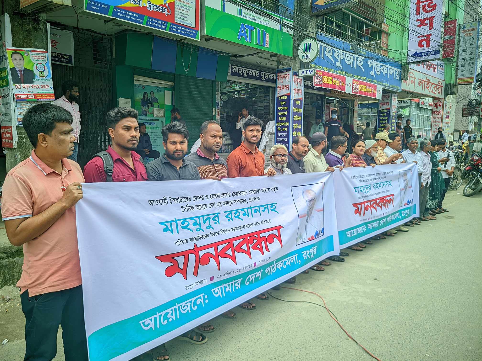 আমার দেশ প্রত্রিকার সম্পাদক সহ চার সাংবাদিকের বিরুদ্ধে হয়রানিমূলক মিথ্যা মামলা প্রত্যাহারের দাবিতে মানববন্ধন