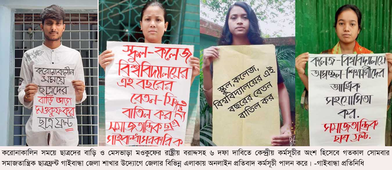 করোনাকালিন সময়ে ছাত্রদের বাড়ি ও মেসভাড়া মওকুফের রাষ্ট্রীয় বরাদ্দের দাবিতে সমাজতান্ত্রিক ছাত্রফ্রন্টের অনলাইন প্রতিবাদ