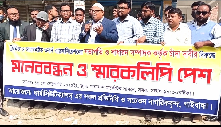 বিশেষ প্রতিনিধি : ক্লিনিক ও ডায়াগনষ্টিক ওনার্স অ্যাসোসিয়েশনের সভাপতি ও সাধারন সম্পাদক কর্তৃক চাঁদা দাবীর প্রতিবাদে মানববন্ধন ও স্মারকলিপি পেশ