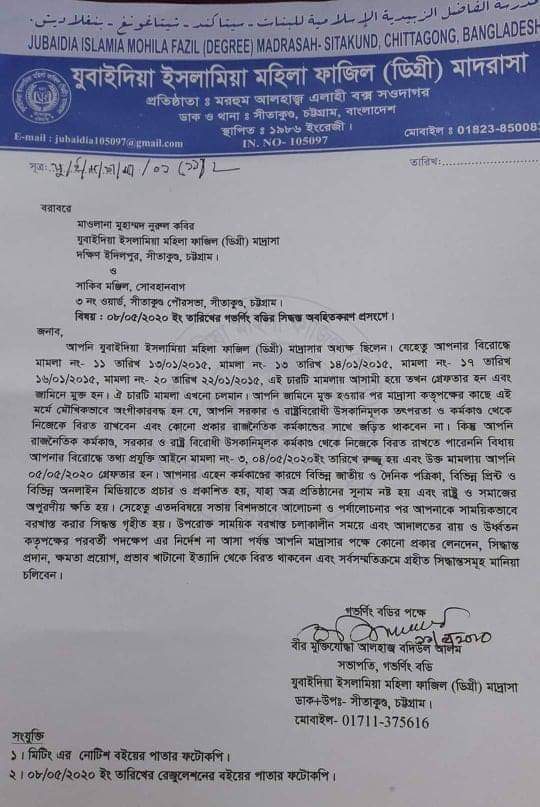 সাঈদী রাজাকারের মুক্তির দাবিকারী অধ্যক্ষ মাওলানা মুহাম্মদ নুরুল কবির বরখাস্ত